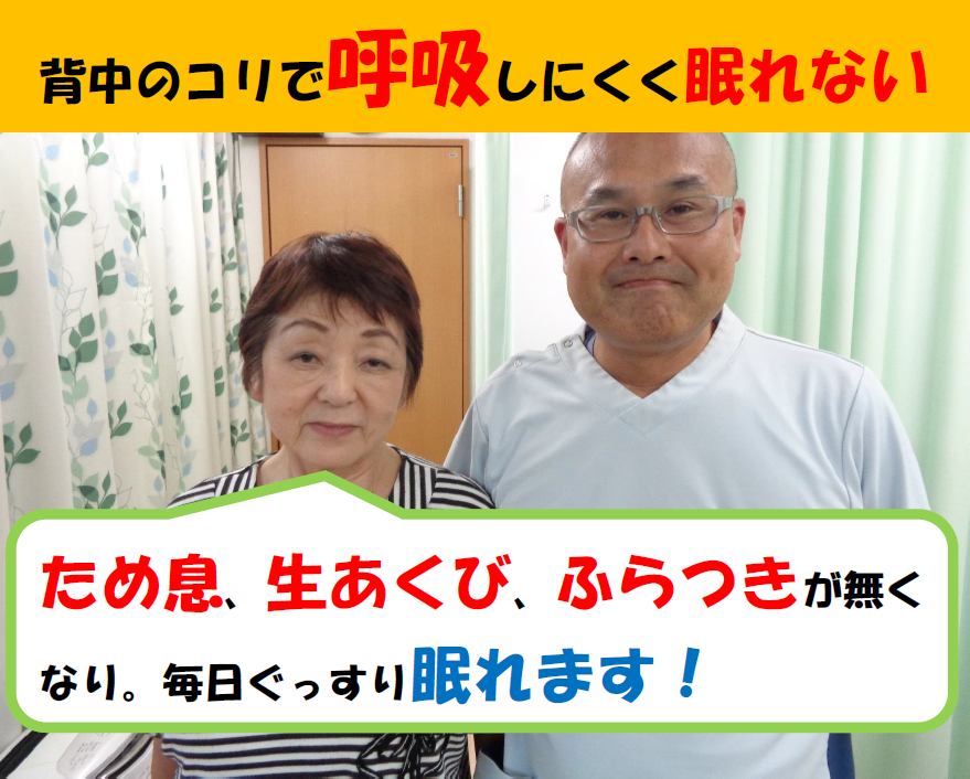 初回の施術でその日は朝までぐっすり眠ることができ、驚いたのを覚えています。数回目には日常生活にはほとんど支障がないほどにまで回復しました。